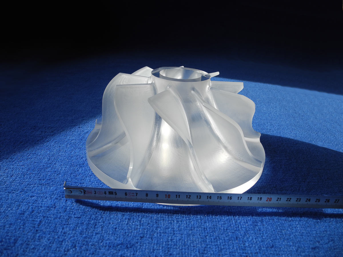 Dieser Impeller wurde aus 100 mm starkem Plexiglas® in einer Aufspannung gefräst. Der Durchmesser beträgt ca. 230 mm.